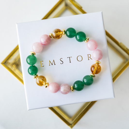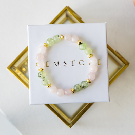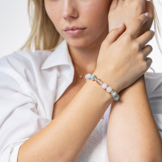 Rosenquarz Armband mit Kiwi Jaspis und Bergkristall
